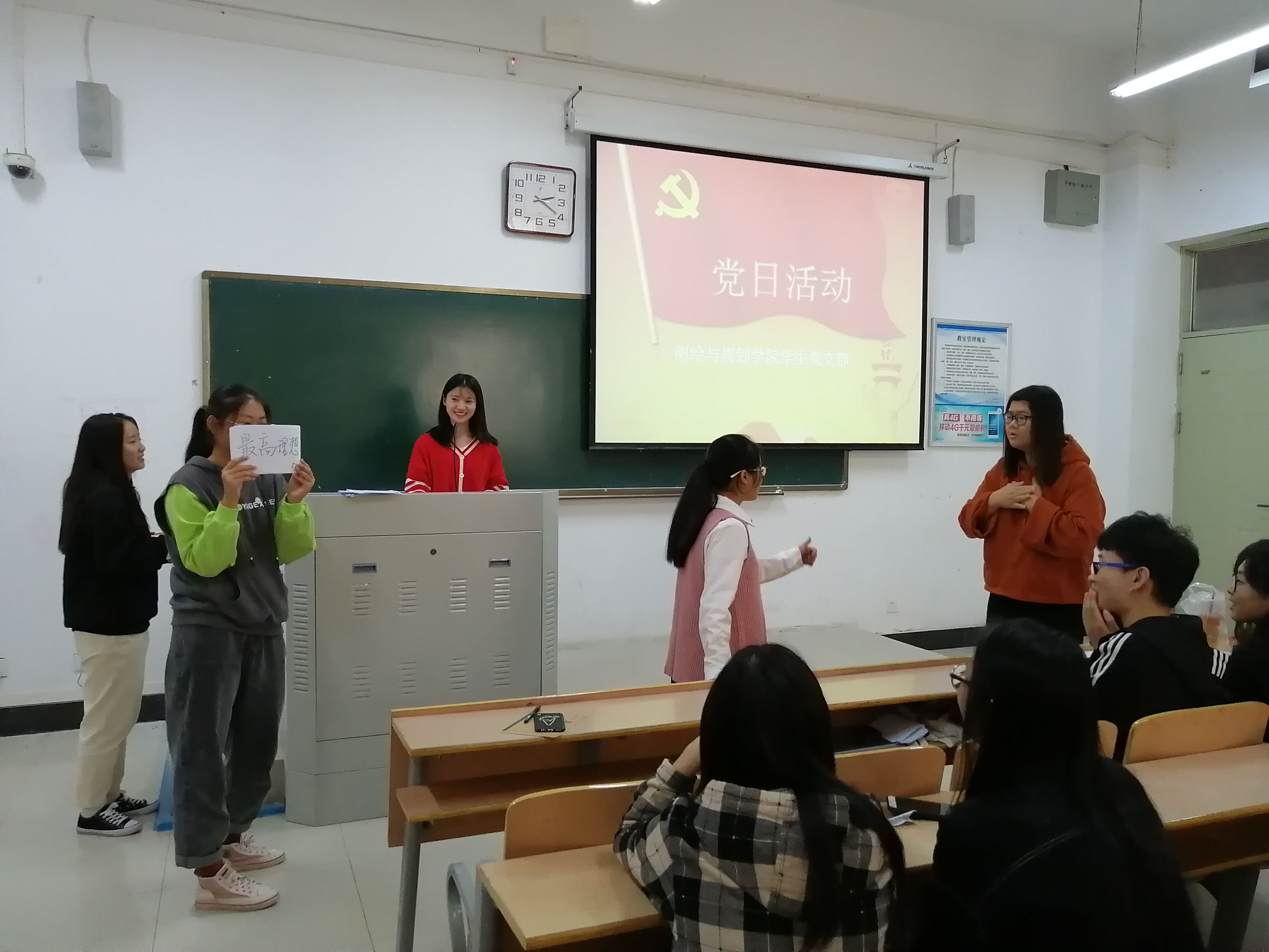 本次党日活动中比赛采用积分制,以小组为形式进行初赛、半决赛和决赛,比赛的猜词内容涵盖两百余个有关党的理论知识词组和关键词。比赛涉及“初心”“使命”、道路自信”“两学一做”等党的先进理论知识关键词,考察同学们的理解力和表达力。其中,同学们幽默风趣的肢体语言表达和精彩绝伦的反应力引来台下观众此起彼伏的赞叹声和掌声,同时大家也在欢声笑语中学习和掌握了更多党的知识。通过三场赛制的层层选拔,王亚蕊和高珺洁同学脱颖而出,获得一等奖。