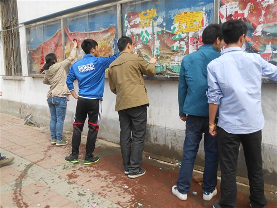 本次活动的主要任务是清理教学楼周边的垃圾以及墙面上的广告。活动任务分配之后,一部分同学负责清理垃圾,将散落在道路上和花坛里的果皮纸屑等垃圾清理到垃圾桶里,一部分同学负责清理墙面上的广告,同学们使用各种清理工具,清除贴在墙上的广告,校园内随处可见大家忙碌的身影。