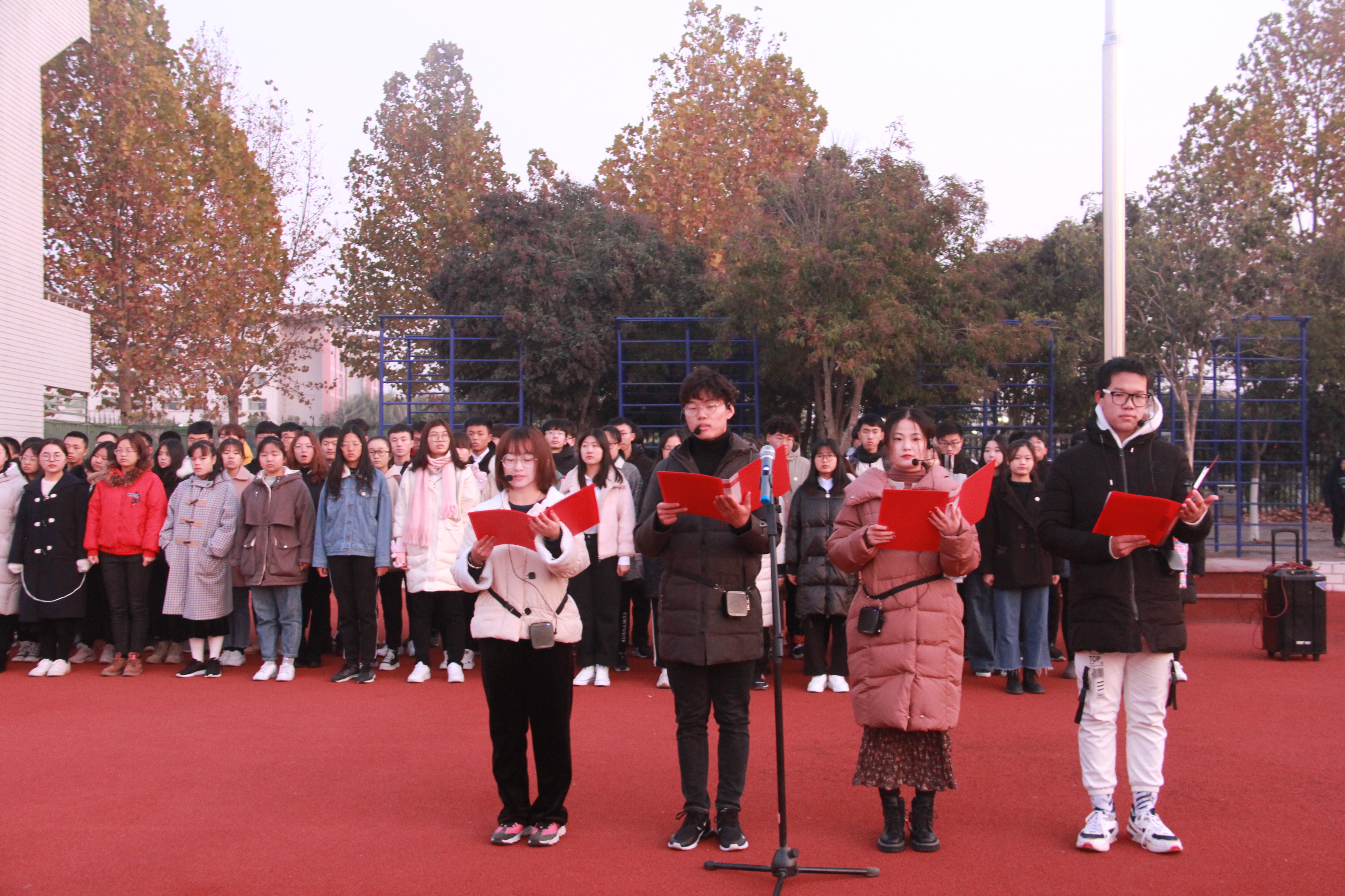 庄严肃穆的升国旗仪式后,四位学生代表朗诵《不忘初心,砥砺前行》,他们以饱满的热情激励全体师生铭记历史、不忘初心、牢记使命,为党和国家创造更加美好的未来。随后,2019级合唱团演唱《没有共产党就没有新中国》,表达了对祖国的无限热爱和对革命先辈的崇高敬意。