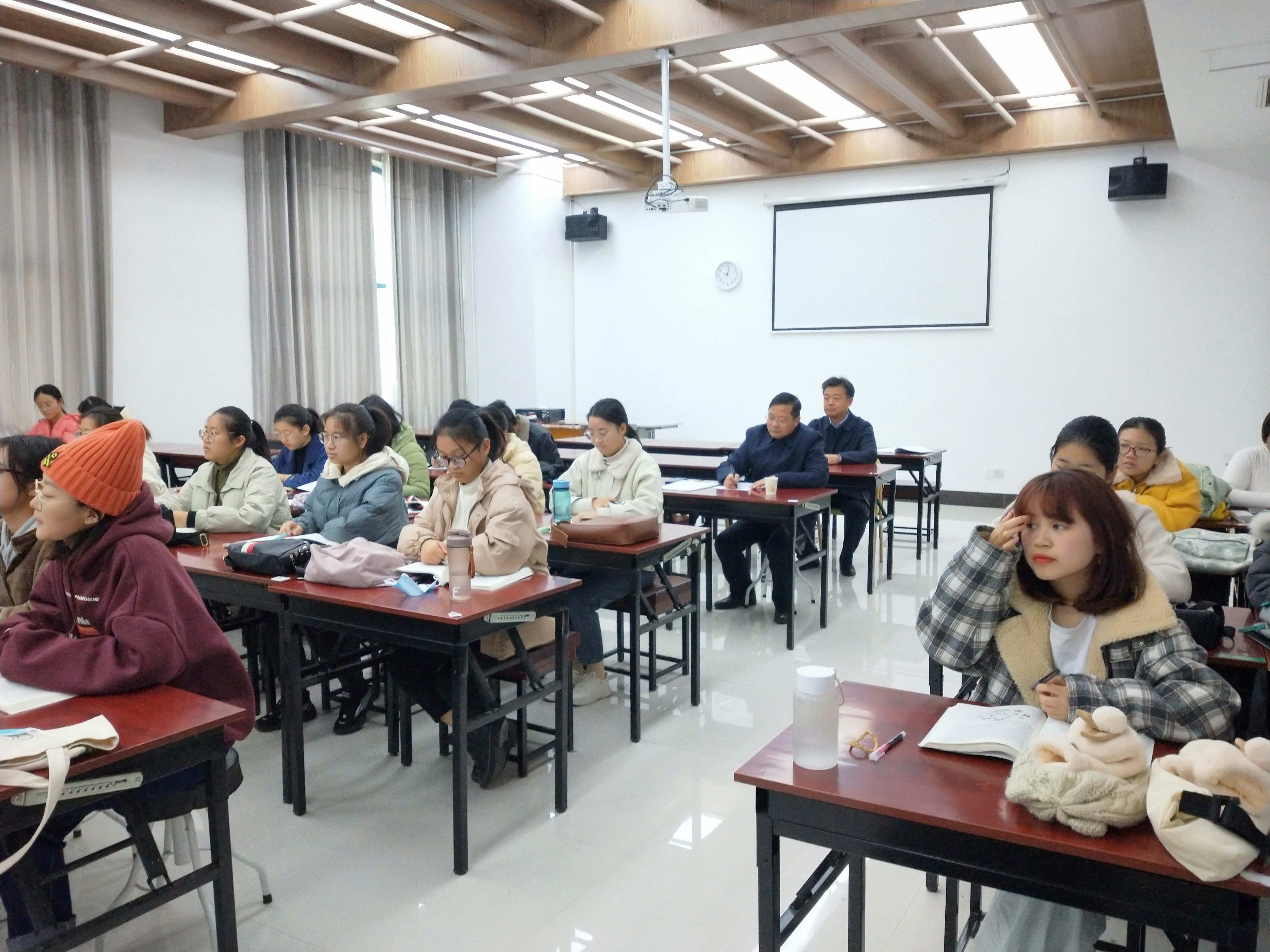 课后程校长与任课教师进行了简短的交流,认为侯颖老师备课充分,教学设计合理,讲课条理清晰,能结合具体案例进行分析,对学生进行启发式教学,教学效果良好,同时也对课程的学时设置、实践教学安排等提出了很好的建议。