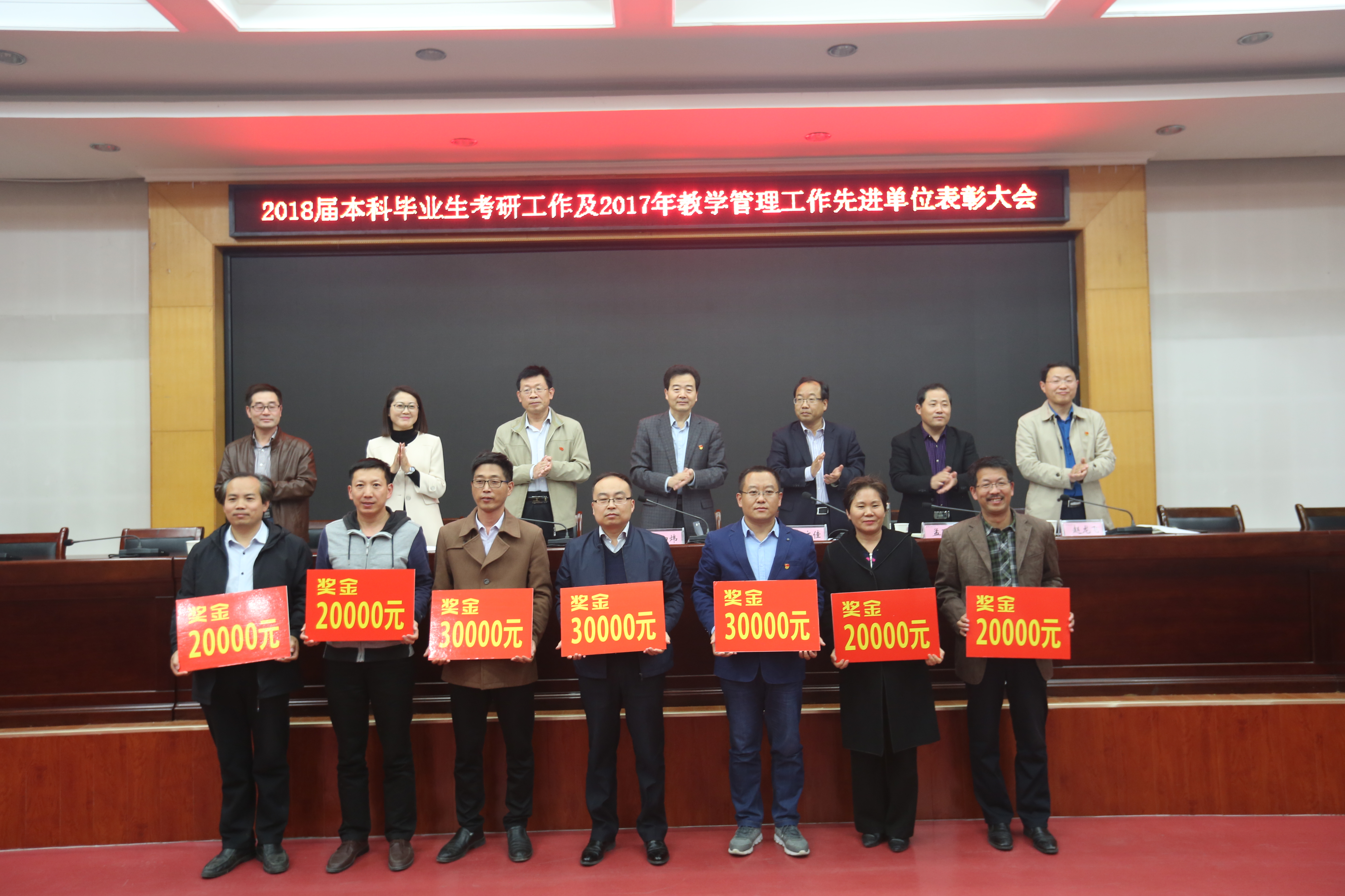 10月26日下午,我校在平原路校区召开了2018届本科考研工作表彰大会。副校长陈向炜、郭文佳出席会议,教务处、学生处、招生与就业处、校团委、教学评价与教师发展中心等部门负责人及各学院院长、副书记、教学副院长、教学办主任、考研辅导教师代表、大四(2019届毕业生)辅导员、大四学生代表参加了此次会议。会议由郭文佳副校长主持。会上, 招生与就业处处长庞永祥宣读了《商丘师范学院关于2018年考研工作先进单位表彰的决定》。副校长陈向炜、郭文佳及与会领导向获奖单位颁发了奖金和奖牌。