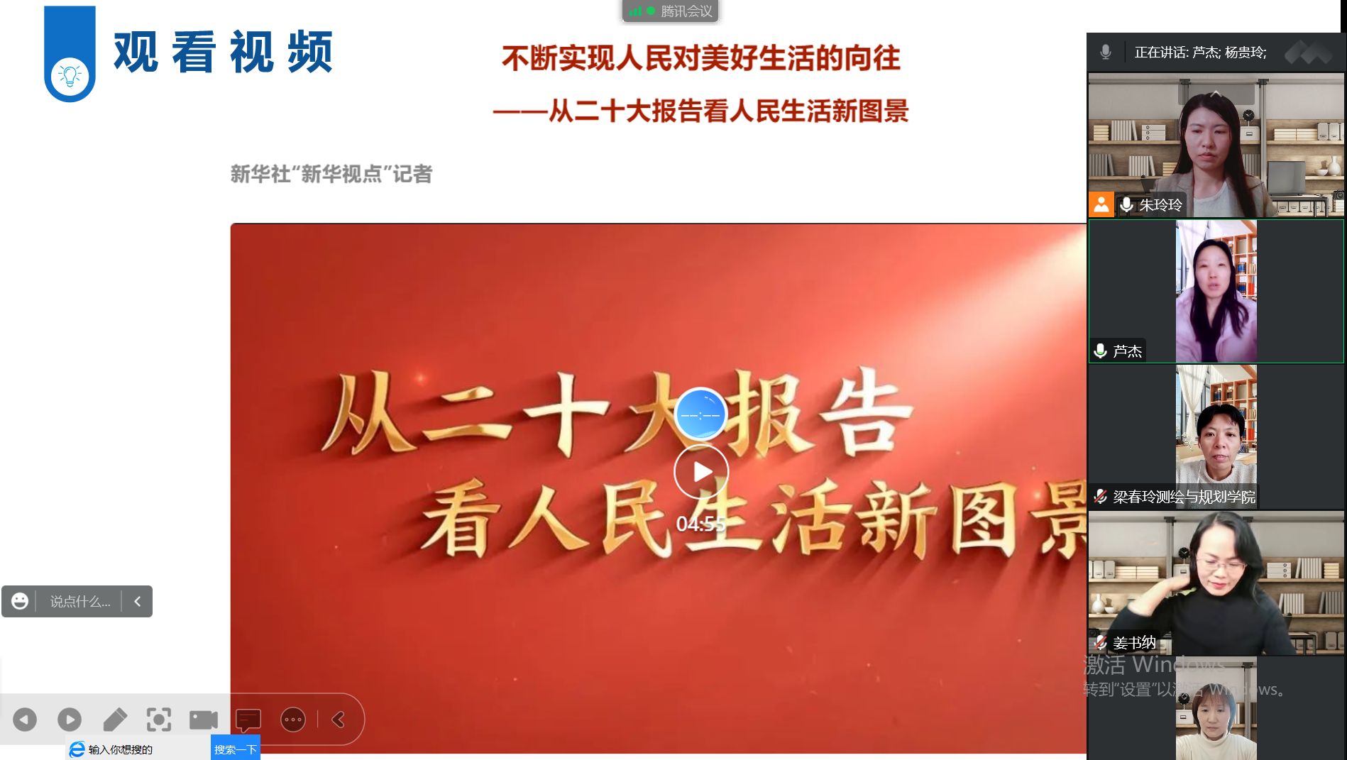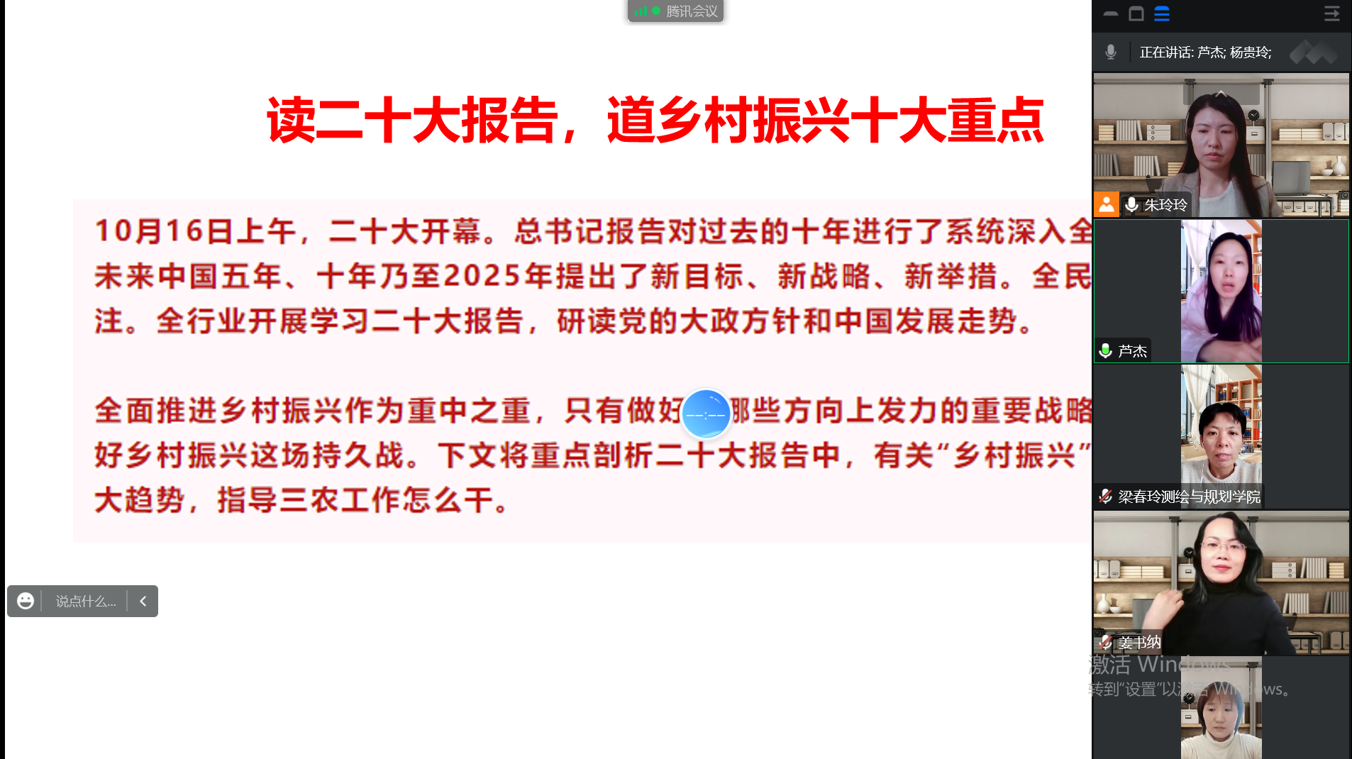 首先,朱玲玲老师带领大家学习了党的二十大报告中的部分内容,习近平总书记指出全面推进乡村振兴作为我国未来发展重中之重,只有做好在哪些方向上发力的重要战略决策,才能打好乡村振兴这场持久战。然后老师们围绕二十大报告中有关“乡村振兴”的内容进行了重点交流讨论,主要有推进城乡基本公共服务均等化;接续推进农村人居环境整治提升行动,抓好改厕和污水、垃圾处理;合理确定村庄布局分类,注重保护传统村落和乡村特色风貌,加强分类指导。