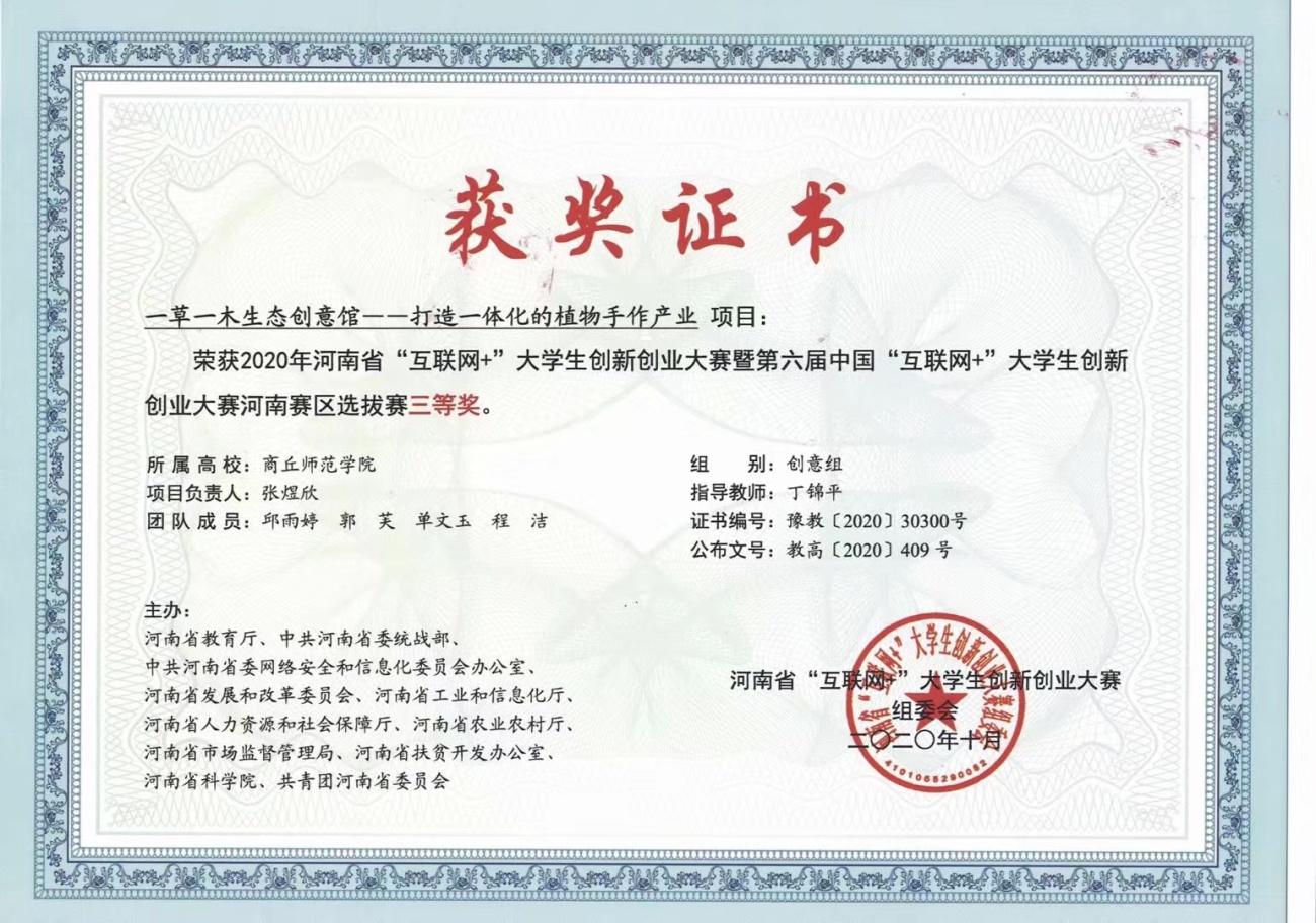 河南省创新创业训练计划优秀成果奖 三等奖 |